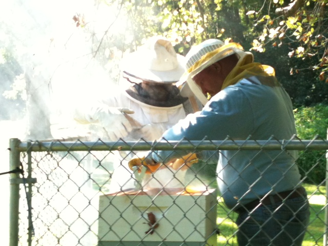 Had a wonderful opportunity yesterday morning (Monday) to learn first hand about beekeeping! Our close friends and neighbors Linda & Sonny Jobe invited Paula and me to help them tend to their bees. Sonny very graciously let me wear his Bee Keepers Suit (helped to settle my nerves, this being my first time to be this close to a large swarm of bees). When I was a very young child living in the country just south of Boston Massachusetts, while playing follow the leader with my sisters and my brother, I was the last in line (being the youngest – smallest) and as we ran through the woods a branch that was pulled back by my brother as he ran past hit me in the face causing my eyes to water. Stumbling around crying and rubbing my eyes, I walked into a wasp nest and was severely stung. Rushed to the doctor’s office, the doctor removed in excess of one hundred stingers from my swelled up body, but I digress.